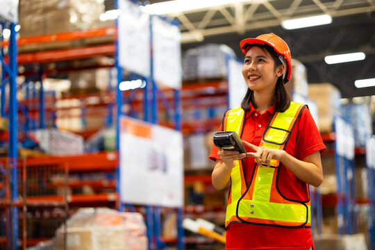 Warehouse female staff worker wearing hardhat helmet working on barcode scanner handheld at warehouse factory