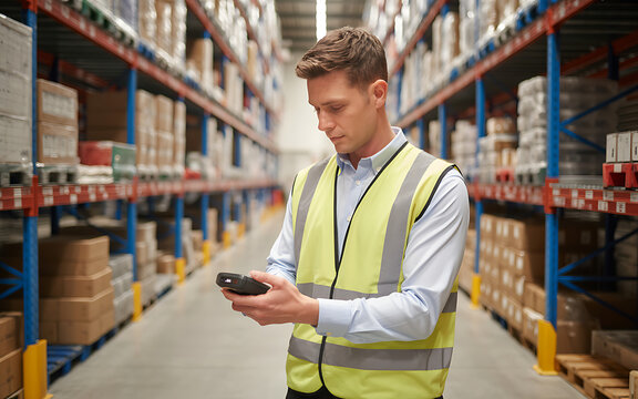 Worker using handheld barcode reader on container in high visibility jacket for safety and inventory control
