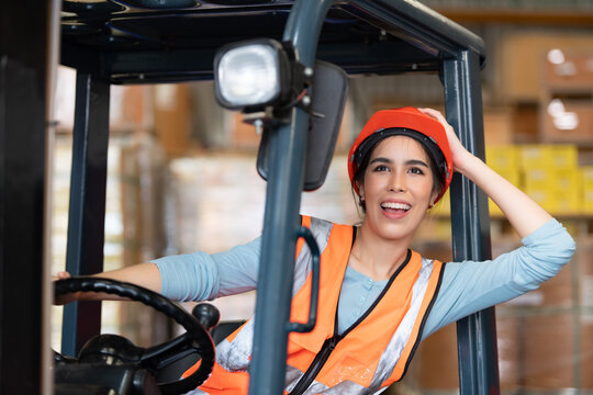 Portrait of an Asian woman with a forklift used to lift heavy objects in a warehouse.