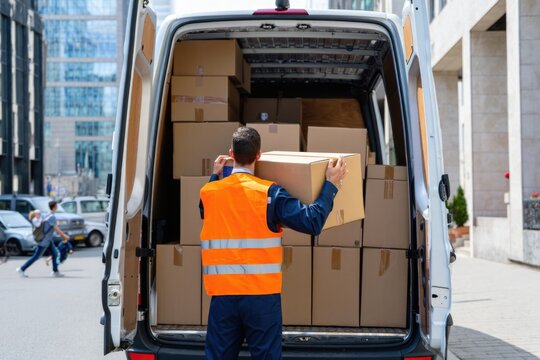A delivery worker loading boxes into a delivery van, preparing e-commerce packages for delivery to customers