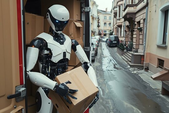 Directly above shot of delivery humanoid robot unloading cardboard boxes from truck on street.