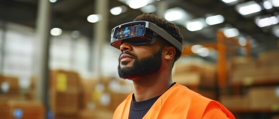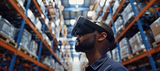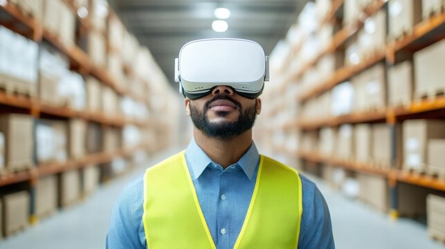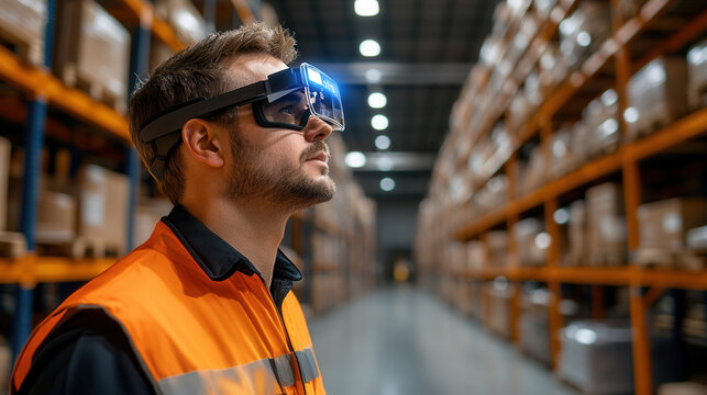 Warehouse worker uses VR glasses to optimize package picking for efficient delivery. Concept Warehouse Operations, Virtual Reality Technology, Package Picking, Efficient Delivery