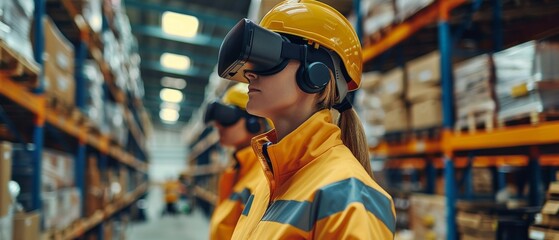 Warehouse workers use AR glassesheadsets for efficient picking in augmented reality. Concept Warehouse Technology, Augmented Reality, Efficient Picking, AR Glasses, Warehouse Workers