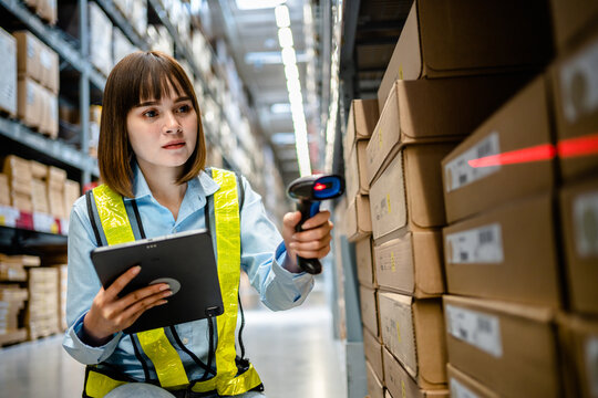 Warehouse worker scanning barcode on box in a large warehouse. Smart woman worker scanning package with barcode scanner while using digital tablet in warehouse.