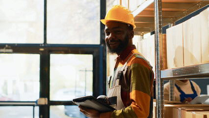 Small business warehouse worker inventory scanning and working process using tablet technology for stock updates, order control, parcel organization, shipping workflow in modern storage workpace