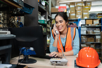 Smiling Asian young female using telephone talking with client at warehouse factory office. Woman worker using desktop computer check product order shipment for customer.
