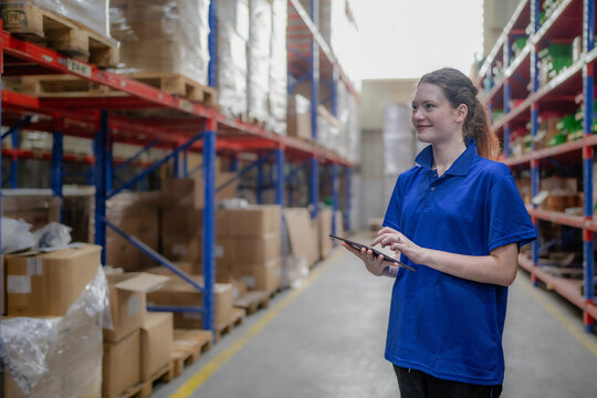 Warehouse Worker using digital tablets to check the stock inventory in large warehouses, a Smart warehouse management system, supply chain and logistic network technology concept.