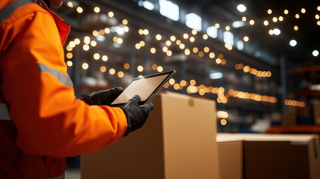A worker in an orange jacket uses a tablet while surrounded by stacked boxes and decorative lights in a warehouse setting.