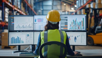 Factory worker is analyzing data on multiple screens in warehouse, utilizing industrial technology for stock management and efficiency. Safety vest and hard hat are worn for worker safety