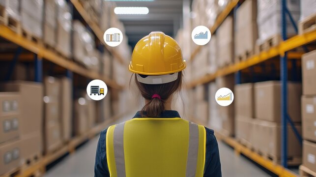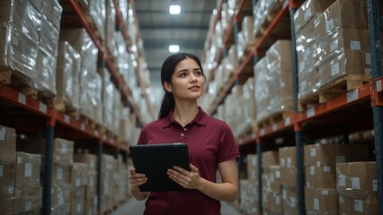 Efficient Female Warehouse Worker Utilizing Technology to Manage Inventory in Modern Supply Chain Logistics Setting