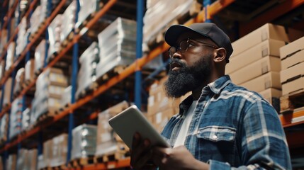 Modern warehouse logistics worker utilizing digital tablet for efficient package tracking