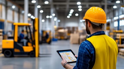 Warehouse Management: Worker Utilizing Digital Tablet for Efficient Inventory and Logistics Operations