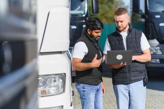 Truck drivers using laptop managing logistics fleet