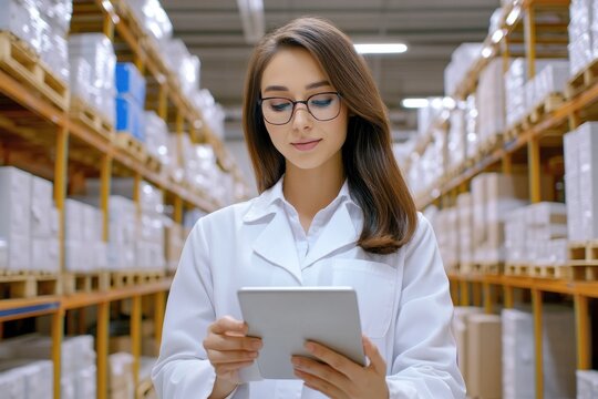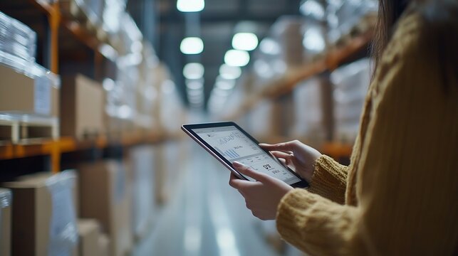 Female inventory manager analyzing stock levels on a tablet in a bustling distribution center, surrounded by shelves and workers.