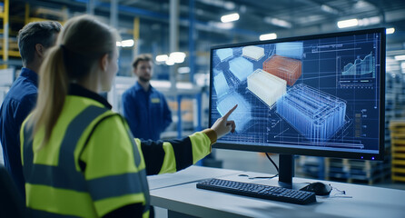 Warehouse Workers Analyzing Logistics and Inventory Data on a Large Display Screen in Distribution Center