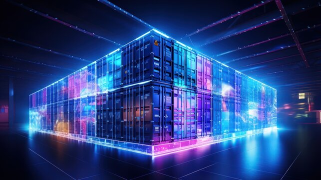Concept of modern accounting and warehousing of containers in large storage areas. Digital neon illumination of storage bins, their numbers and names of packaged goods with delivery addresses.
