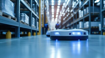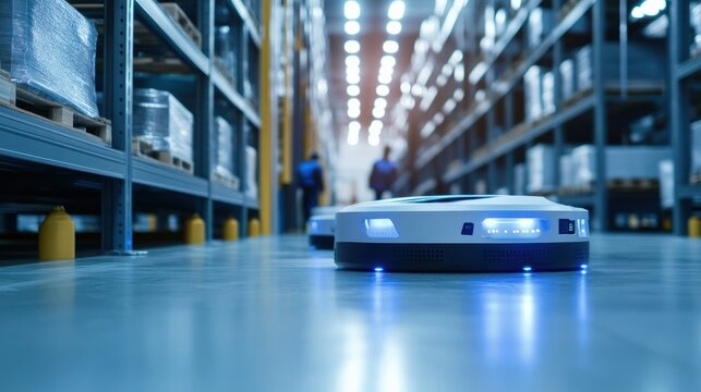 A clean and organized warehouse, with staff managing stock and robotic systems optimizing workflow