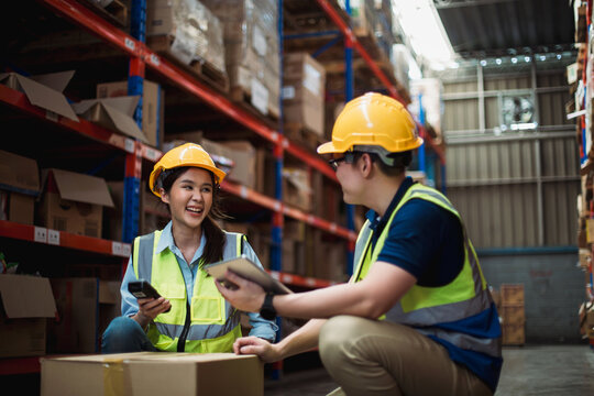 Asian warehouse staff discussing inventory using mobile scanner while checking stock in large industrial storage facility. Teamwork and productivity concept.