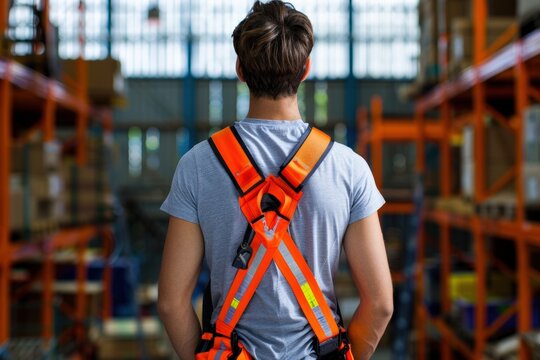 Warehouse worker wearing bright orange safety harness ensuring fall protection while working on high storage shelves, Proper safety measures implemented prevent accidents, enhance workplace security.