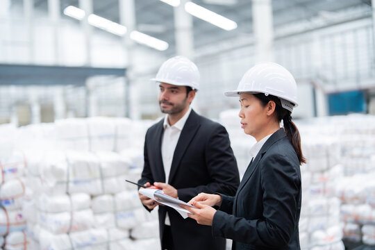 Warehouse workers discuss logistics strategy in industrial environment