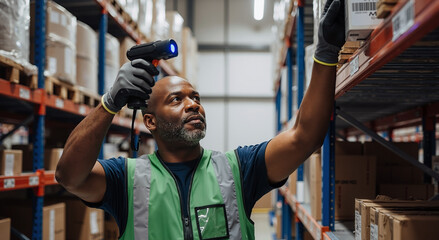 warehouse worker organizing inventory using barcode scanner amid rows of shelves
