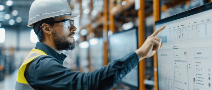 A warehouse worker interacting with an AI-powered inventory management system, receiving real-time updates and suggestions