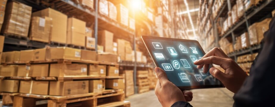 Warehouse worker checking inventory in logistics Concept. Man Using Tablet to View World Map in Warehouse Environment
