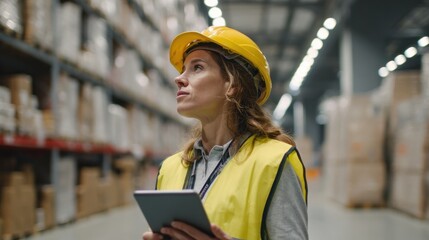 A highly skilled professional woman wearing safety gear is efficiently managing inventory using a tablet