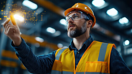focused engineer in safety vest and helmet interacts with augmented reality technology, showcasing innovation in industrial setting