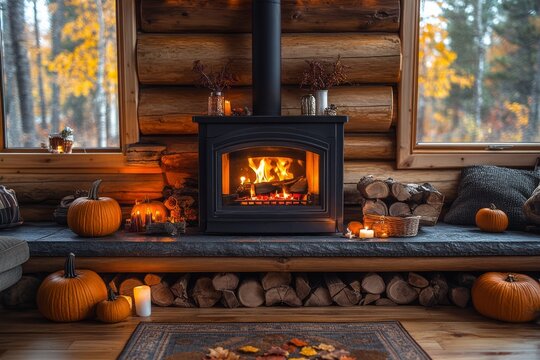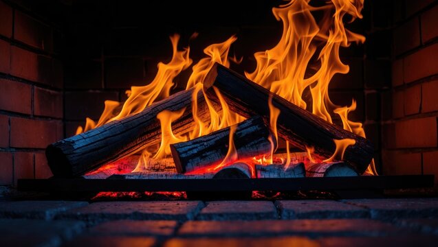 Cozy fireplace with burning logs and glowing embers serving as a warm interior background, winter awareness