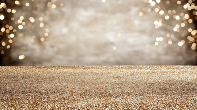 Gold glitter surface with soft bokeh glow creating festive warm atmosphere
