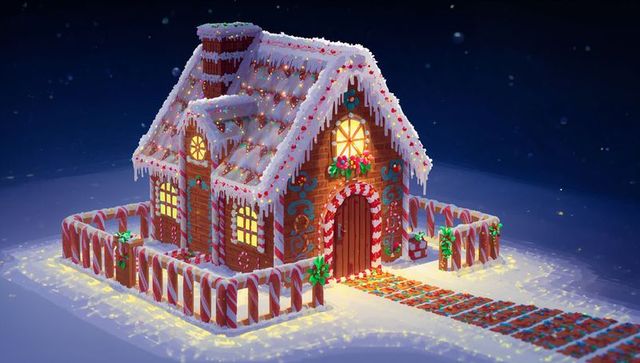 Snow-covered mini christmas tree with warm lights and red ornaments at sunset