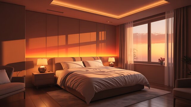 A modern and warm bedroom interior bathed in the golden light of sunset