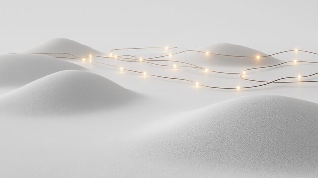 Winter foliage and snow illuminated by warm string lights on white background, cut out transparent