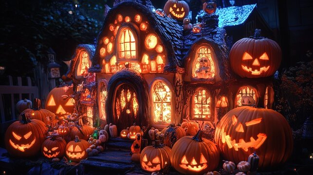 Glowing pixel art forest cottage with lanterns and stone path at twilight, cozy fantasy