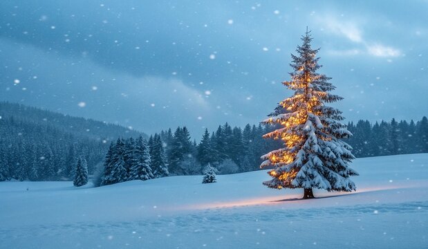 Cozy christmas tree with warm lights in snowy scene