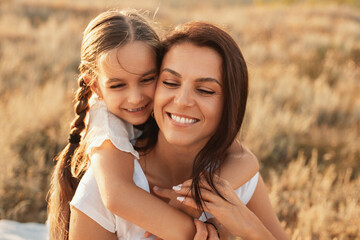 A beautiful, candid moment of a smiling mother and daughter embracing together in a rustic outdoor setting, showcasing love, connection, and natural serenity during a sunlit day.