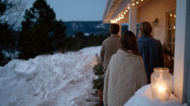 Winter twilight envelops three figures, Northern European descent, savoring a cozy Yule evening, wrapped in soft woolen warmth