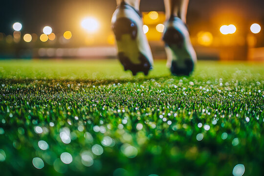Players participate in an evening training session on artificial turf with bright lights illuminating the field and dew on the grass