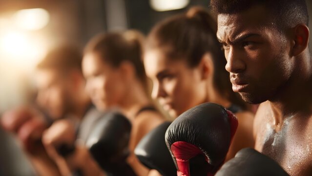 Boxers lined up wearing gloves, ready for training in a gym. Concept Boxing Training, Boxer Lineup, Gloved Athletes, Gym Session, Ready for Training