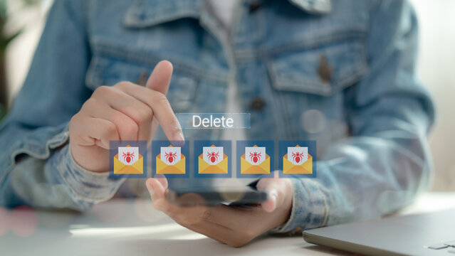 Close-up of a person tapping delete on smartphone to remove virus-infected emails, illustrating email malware detection, cyber threat prevention, phishing scam protection, and digital safety.
