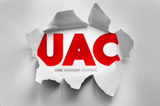UAC acronym for User Account Control exposed through torn paper effect, representing system security, admin rights, user permission prompts, access restriction, and operating system protection layers