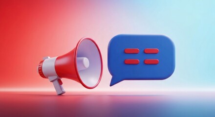 Red megaphone with speech bubble on pink background. Object for announcement, marketing, and public speaking. Modern graphic design concept for alert or news.