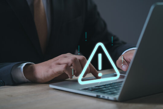 Businessman or User using laptop with problem safety security triangle caution warning sign alarm for notification network error and maintenance concept. warning sign exclamation.