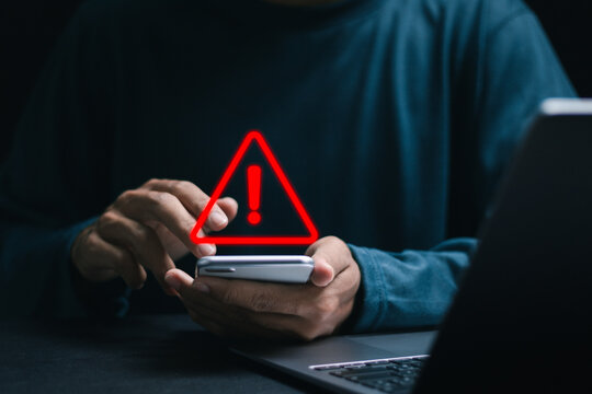 Person using smartphone with warning caution sign. Cyber security alert, notification about virus attack or system error on mobile phone. Data breach, online fraud danger, illegal connection concept.