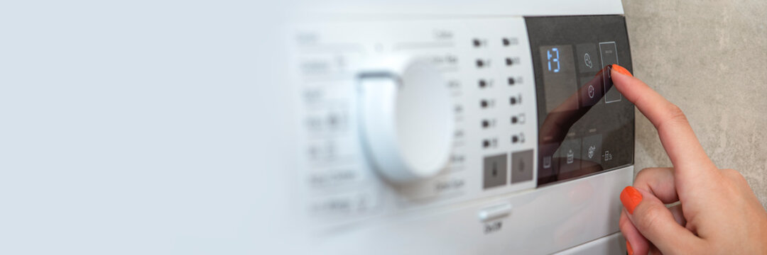 Washing machine. The hand turns on the washing machine or the choice of the washing program. Washing clothes. Banner for website or print with copy space