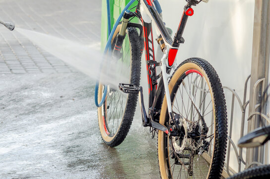 Powerful stream of water washes the bicycle at car wash. High pressure pump. Maintenance.