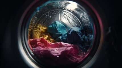 water splashes inside a washing machine drum creating soap suds and bubbles during the washing cycle offering a dynamic view of the laundry process