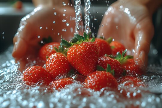 Hands holding ripe strawberries under a shower of fresh water, surrounded by scattered strawberries on a dark surface