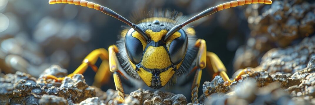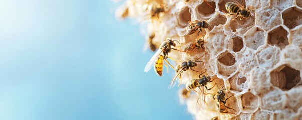Close-up view of a wasp nest with active wasps working diligently against a bright blue sky background